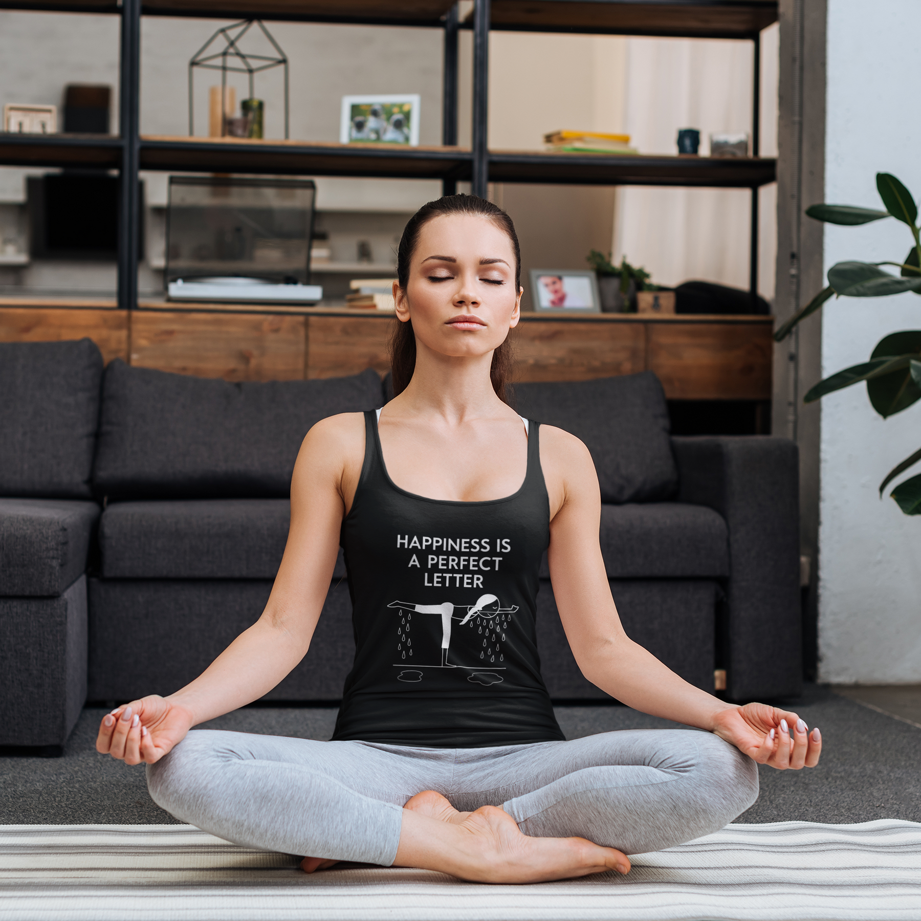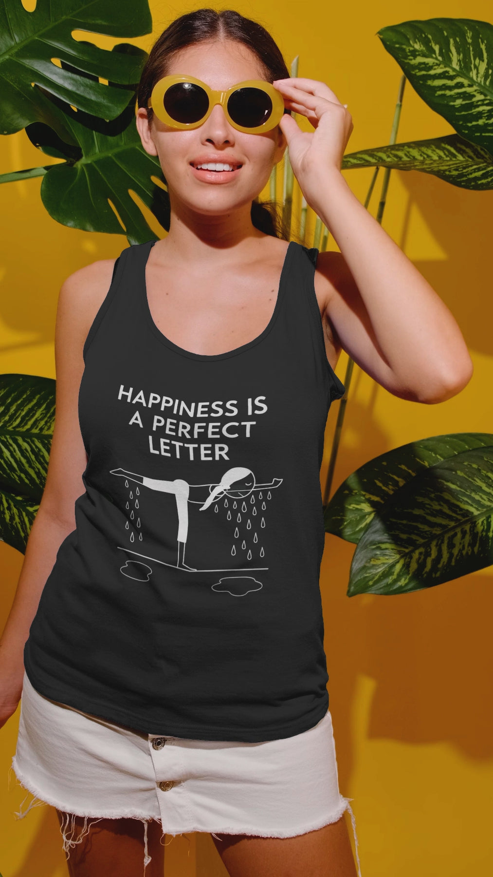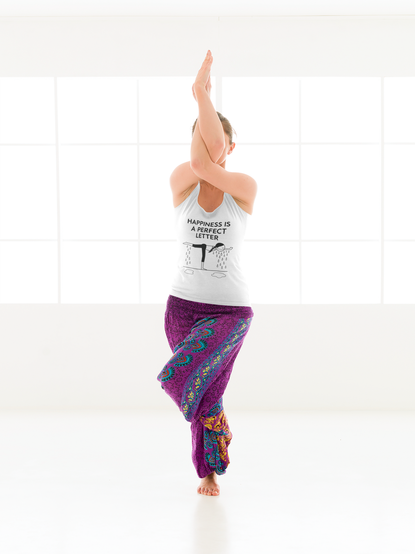 Nail your “T” pose in style with our Happiness Is a Perfect Letter yoga racerback tank! Inspired by the classic phrase hot yoga instructors love to say during the balancing stick pose, this funny yoga racerback tank features a playful stick-figure yogi in perfect “T” formation, dripping with determination into two clear puddles of sweat. A must-have for hot yoga lovers, balancing pose enthusiasts, or anyone who appreciates a good studio laugh.