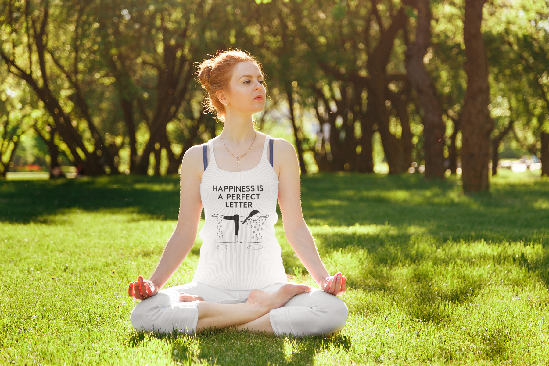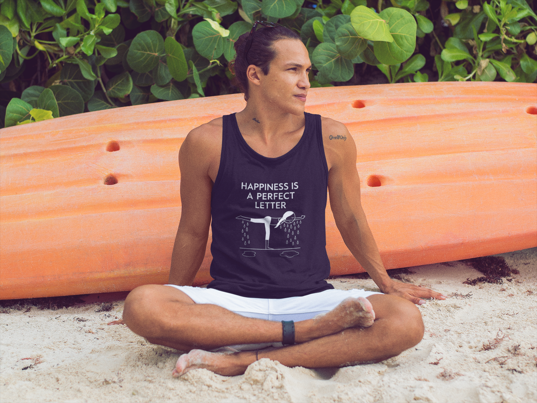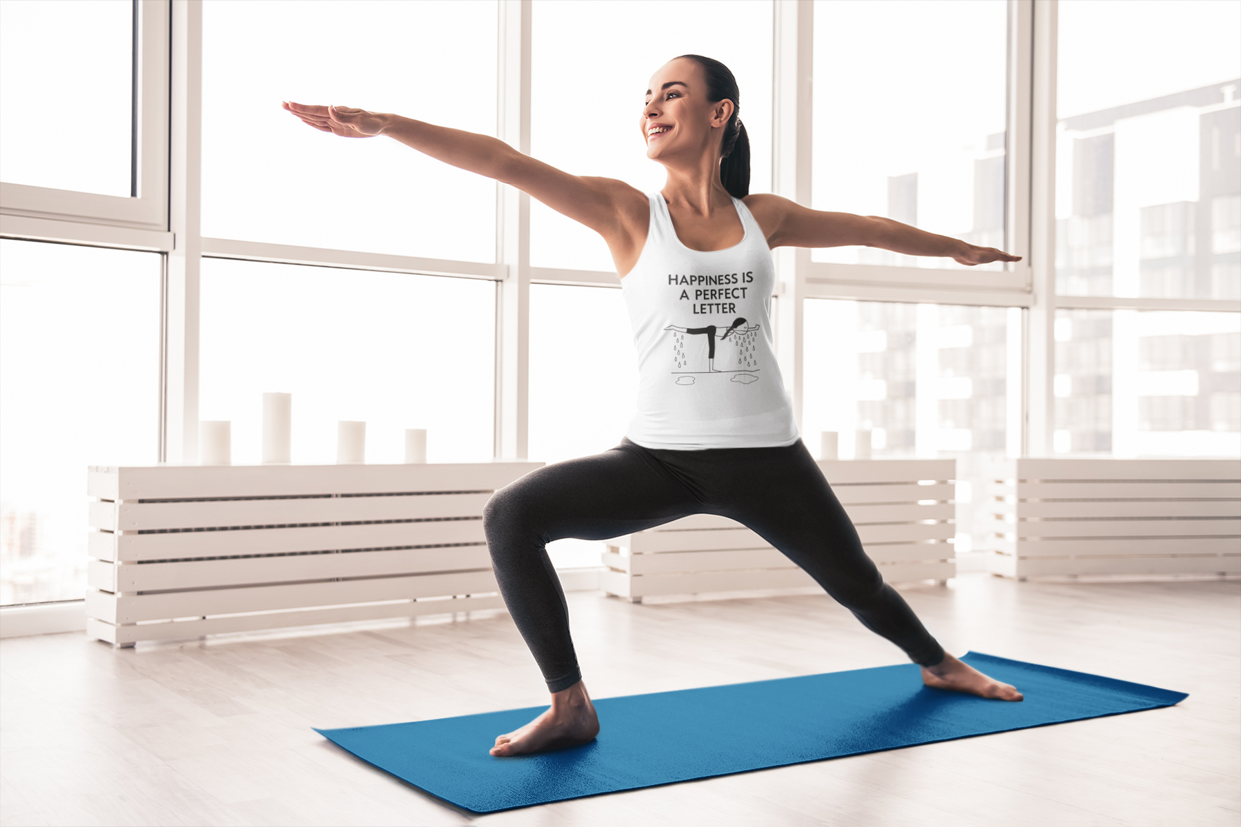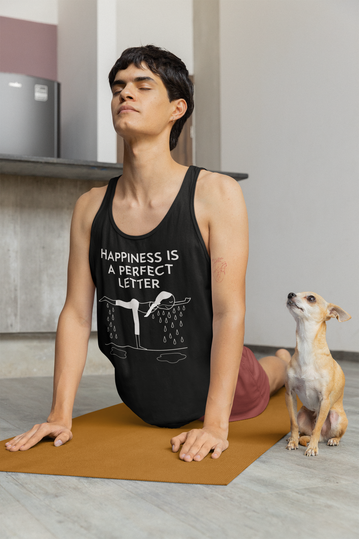 Nail your “T” pose in style with our Happiness Is a Perfect Letter yoga racerback tank! Inspired by the classic phrase hot yoga instructors love to say during the balancing stick pose, this funny yoga racerback tank features a playful stick-figure yogi in perfect “T” formation, dripping with determination into two clear puddles of sweat. A must-have for hot yoga lovers, balancing pose enthusiasts, or anyone who appreciates a good studio laugh.