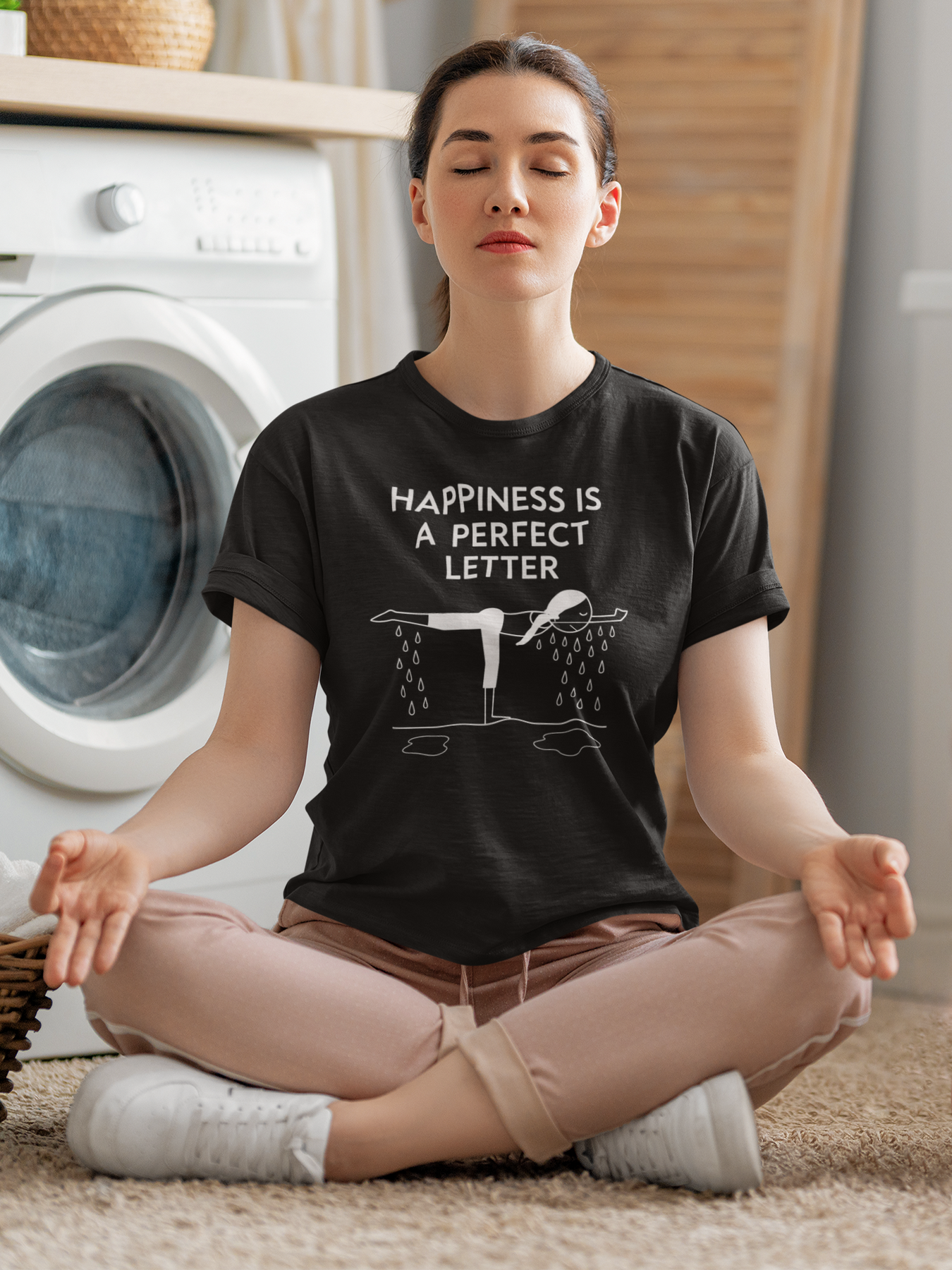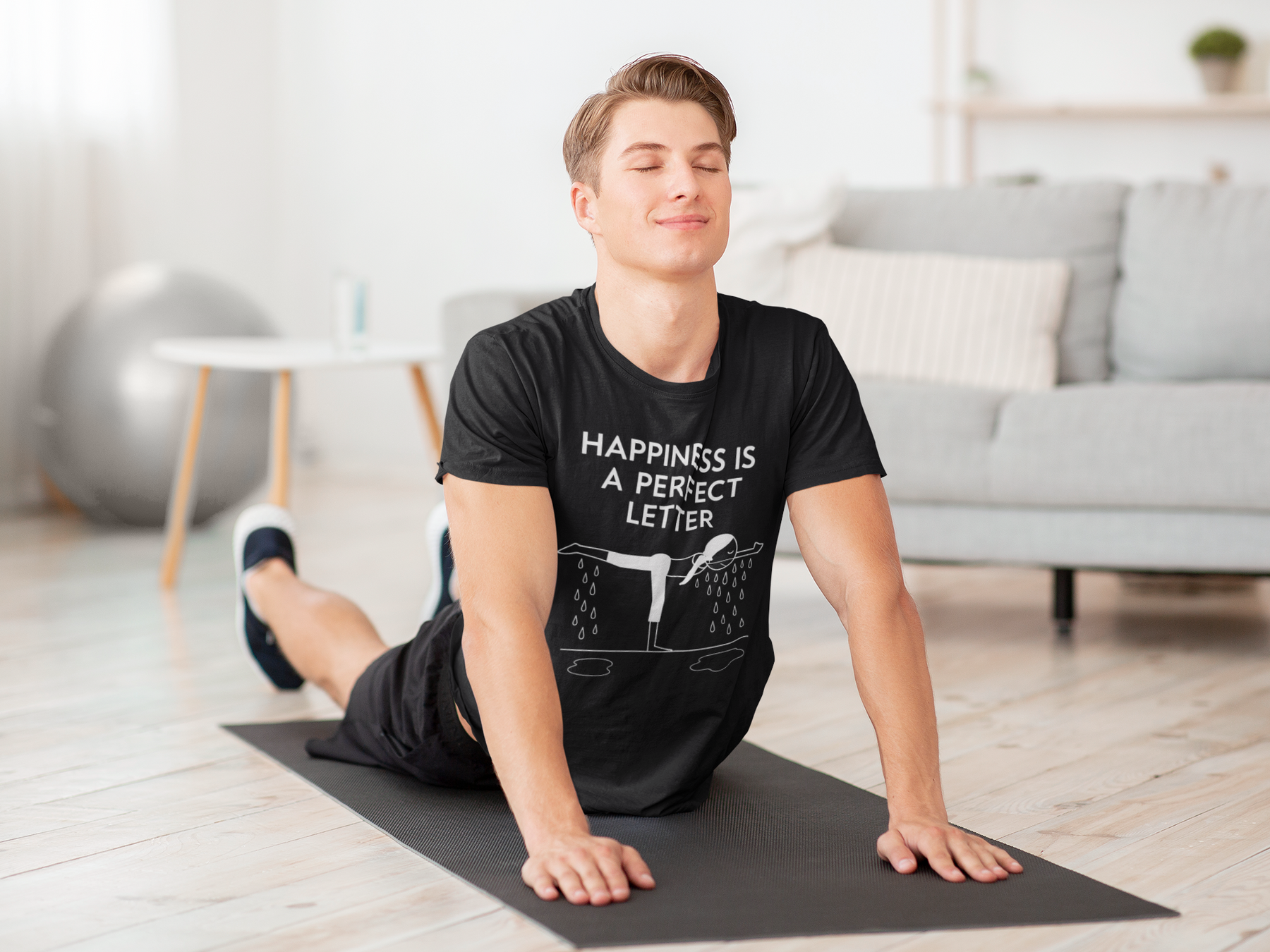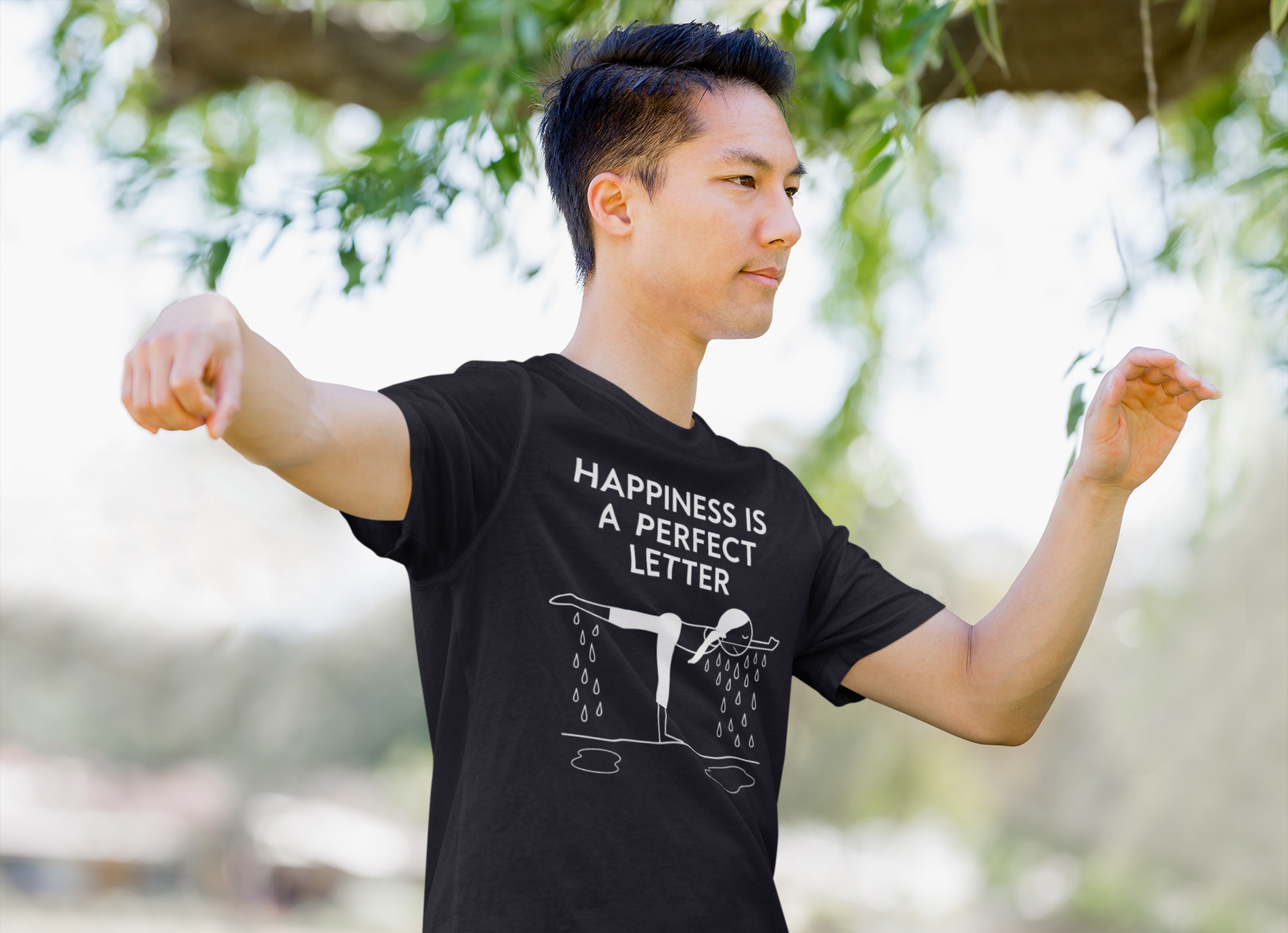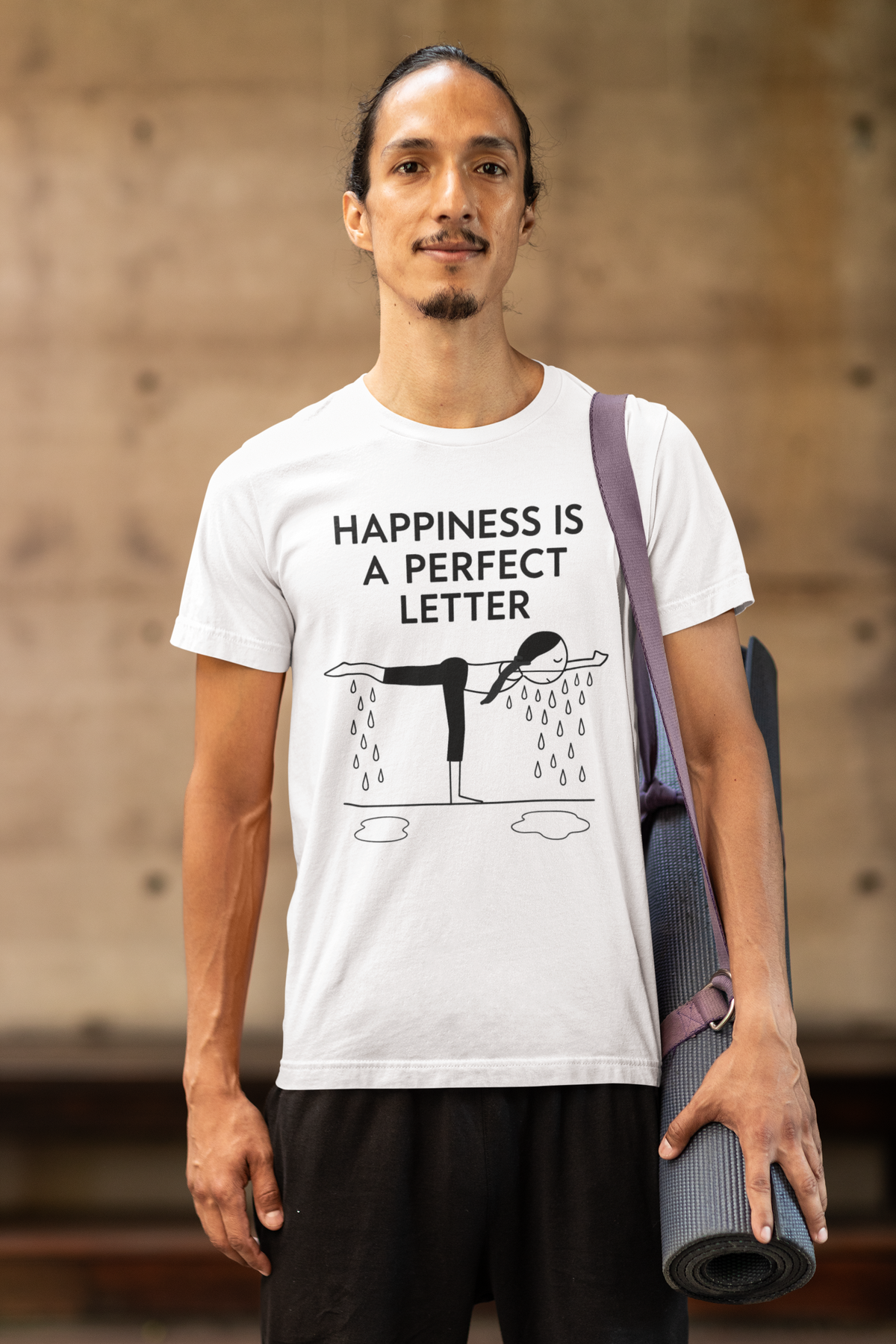 Nail your “T” pose in style with our Happiness Is a Perfect Letter yoga shirt! Inspired by the classic phrase hot yoga instructors love to say during the balancing stick pose, this funny yoga tee features a playful stick-figure yogi in perfect “T” formation, dripping with determination into two clear puddles of sweat. A must-have for hot yoga lovers, balancing pose enthusiasts, or anyone who appreciates a good studio laugh.